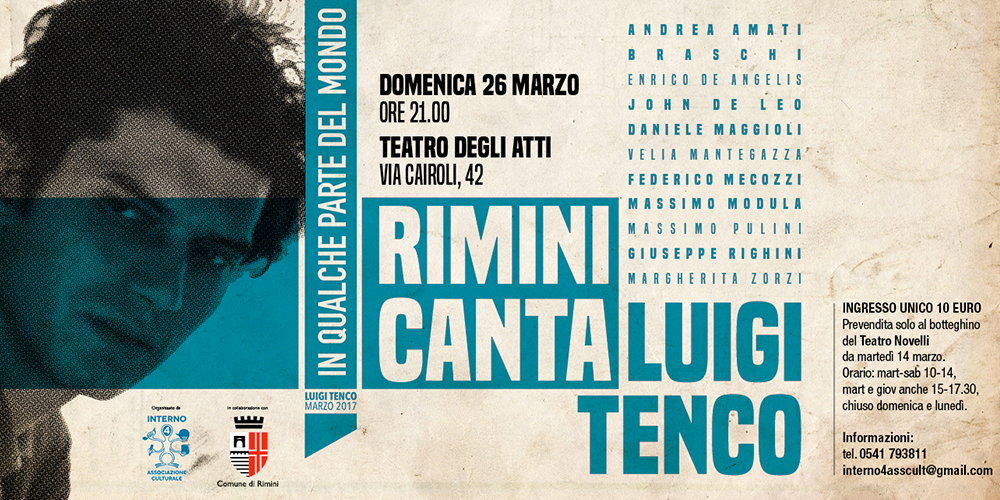 In occasione della ricorrenza del compleanno di Luigi Tenco, nel cinquantenario della sua scomparsa, tutta Italia ha reso omaggio all'indimenticabile cantautore genovese. L’organizzazione culturale Interno4, in collaborazione con il Comune di Rimini ha organizzato un concerto speciale che ha visto la partecipazione di John De Leo, cantante e compositore, già Premio Tenco 1999, i cantautori riminesi Andrea Amati, Federico Braschi, Daniele Maggioli, Massimo Modula e Giuseppe Righini, accompagnati al pianoforte dal giovane maestro Federico Mecozzi.